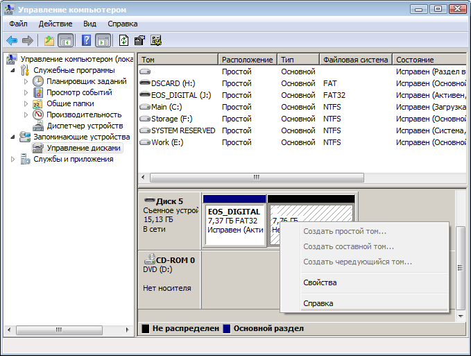 Итак, мы видим что флешка (в моем случае это EOS_DIGITAL J:), поделена весьма странным образом. Половина занята активным разделом, и половина флешки просто не размечена. Кликаем на активном разделе и видим грустную картину — мы не можем ни удалить этот раздел, ни расширить его на весь объем флешки.