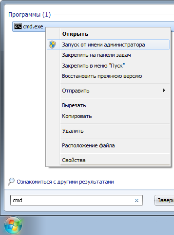 ОК, пришло время для ремонта флешки. Открываем меню «Пуск» и вводим в строку поиска «cmd». Затем кликаем правой клавишей мышки по пункту «cmd.exe» и далее — «Запуск от имени администратора». Если вы обладатель Windows XP, то вы можете нажать Win+R (или Пуск \ Выполнить…) и ввести там cmd.exe и нажать Enter.