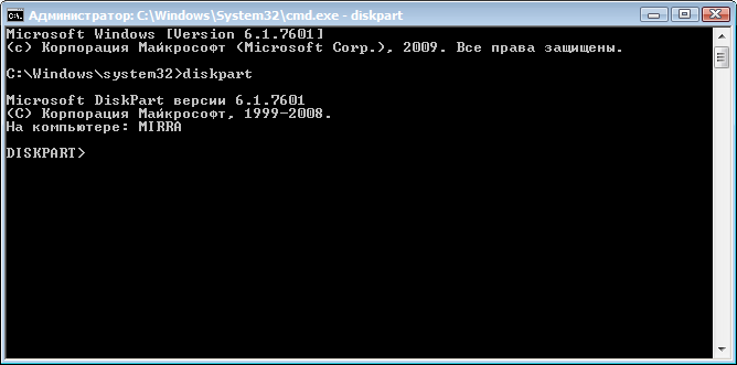 В открывшемся черном окне вводим diskpart и нажимаем Enter. Откроется утилита для работы с дисками, которая может больше чем стандартный интерфейс Windows.