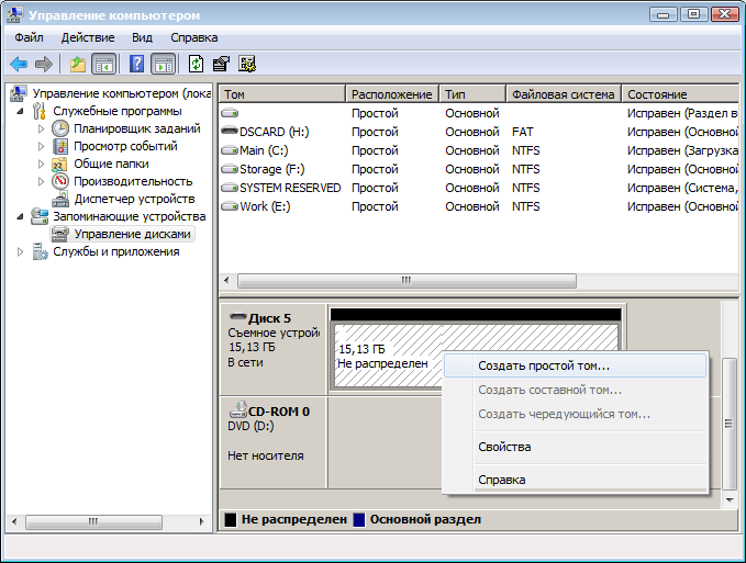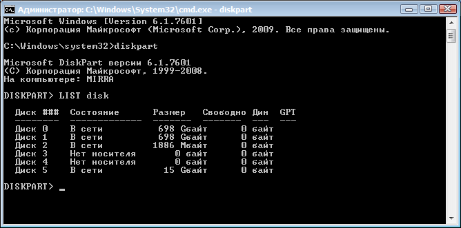 Итак, смотрим на список и вспоминаем что моя флешка 16 Гб (так написано на коробочке). Диск 0, 1 не подходят, они по 698 Гб что явно больше, это два моих жестких диска. Диск 2 не подходит, он всего 1886 Мб, что менее 2 Гб, это флешка во встроенном кардридере. Диск 3 и 4 пропускаем — они не подключены, остается диск 5 — 15 Гб это наша флешка. Вы можете спросить: «почему? Ведь наша флешка 16 Гб, а тут 15!». Так происходит из-за того что производители указывают фактически больший объем на укаковке, нежели чем есть на самом деле. Компьютер считает что в 1 Гб 1024 Мб, а производители флешек считают что в 1 Гб 1000 Мб. Это давно известный факт.