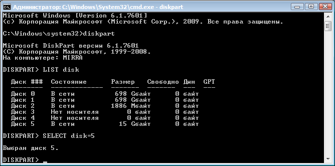 Итак, вы определили номер вашего диска. В моём случае этот номер — 5. Вводим SELECT disk=5 и нажимаем Enter.