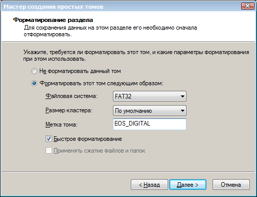 Выставляем нужные параметры. Если это флешка для фотоаппарата, видеокамеры и т.п. то скорее всего лучше выбрать файловую систему FAT32. Размер кластера — по умолчанию. Метку тома лучше сохранить той, которая было до форматирования. У меня фотоаппарат Canon, метка тома EOS_DIGITAL. Хотя в принципе вы можете написать туда что угодно :) Поставте галочку «быстрое форматирование» и нажмите «Далее».